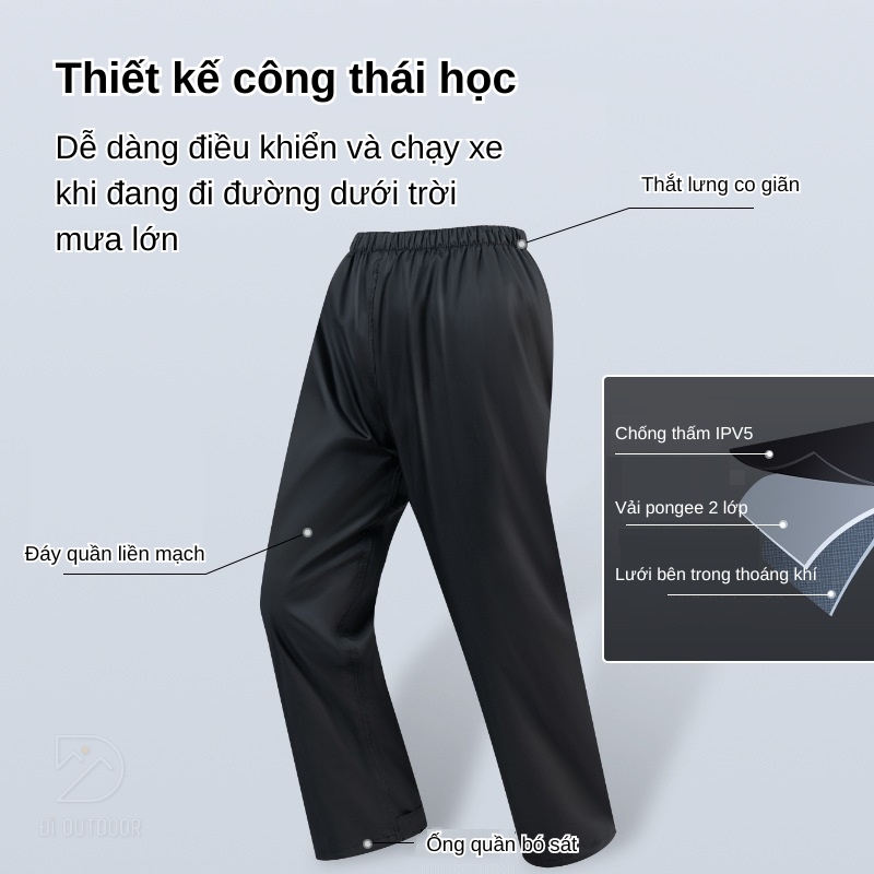 - Thắt lưng co giãn và ống quần chống nước: Với đai thắt lưng co giãn kết hợp quai điều chỉnh 360°, áo mưa luôn vừa vặn và không gây khó chịu. Ống quần được thiết kế chống nước hiệu quả với quai thắt co giãn giữ cho quần không bị tuột và luôn ôm sát vào chân, tránh nước thấm qua.
