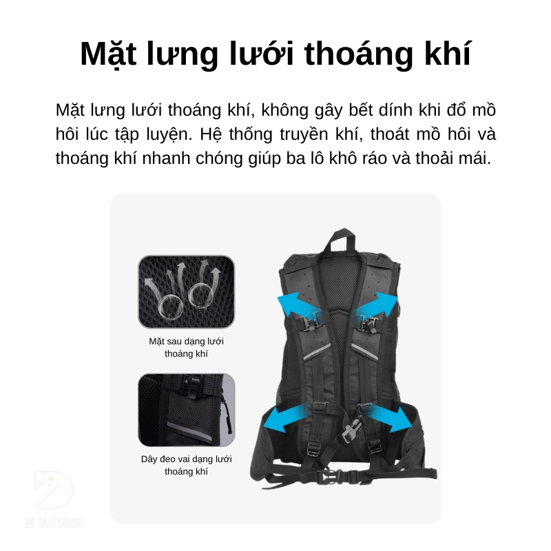 Mặt lưng lưới thoáng khí với hệ thống truyền khí giúp thoát mồ hôi nhanh chóng, giữ balo luôn khô ráo và thoải mái trong mọi hoạt động.