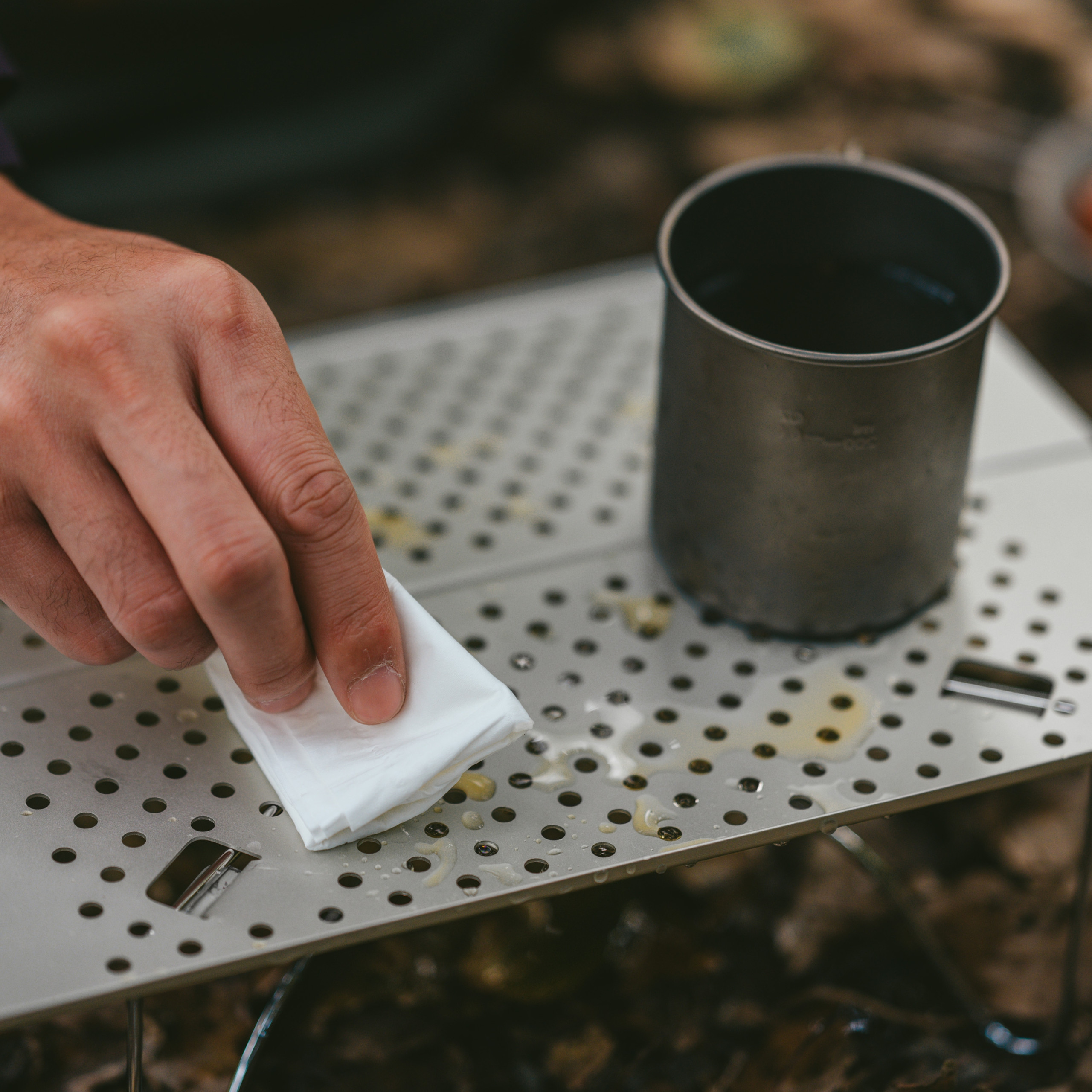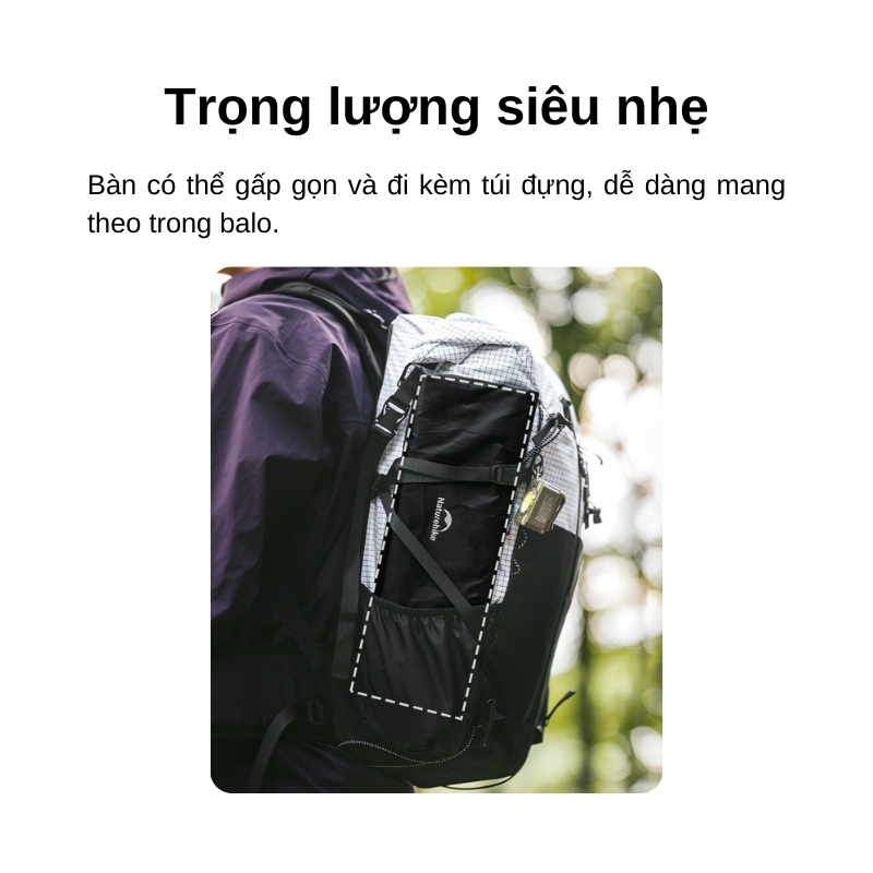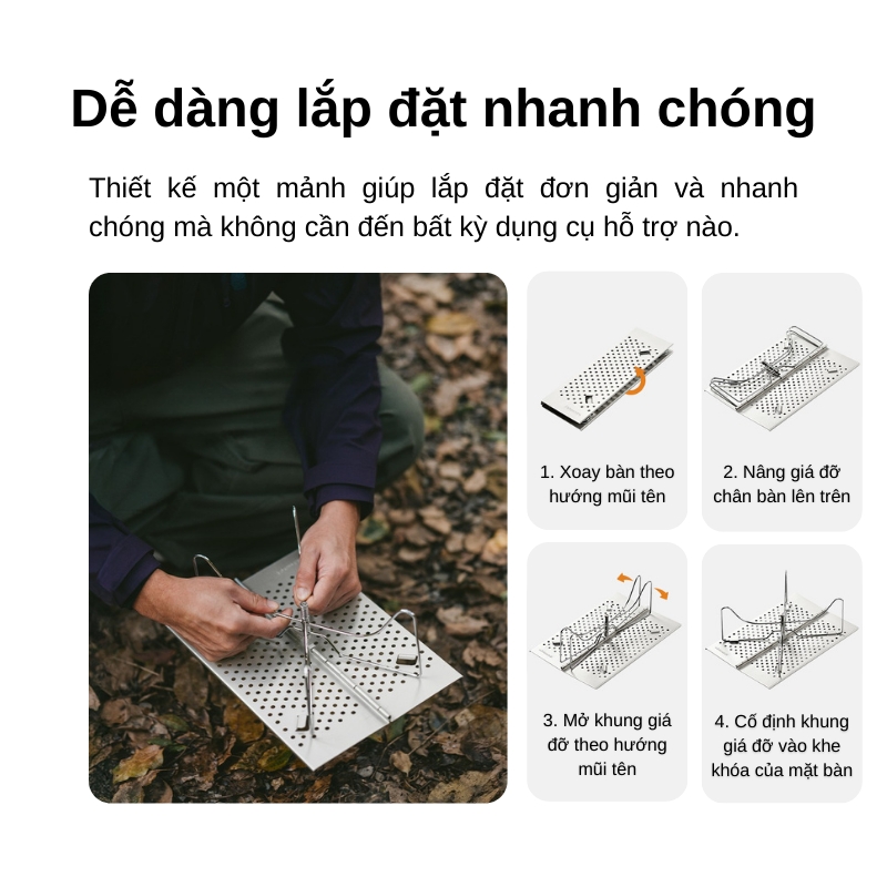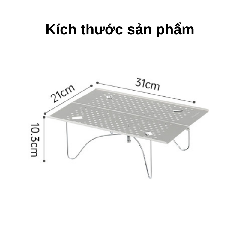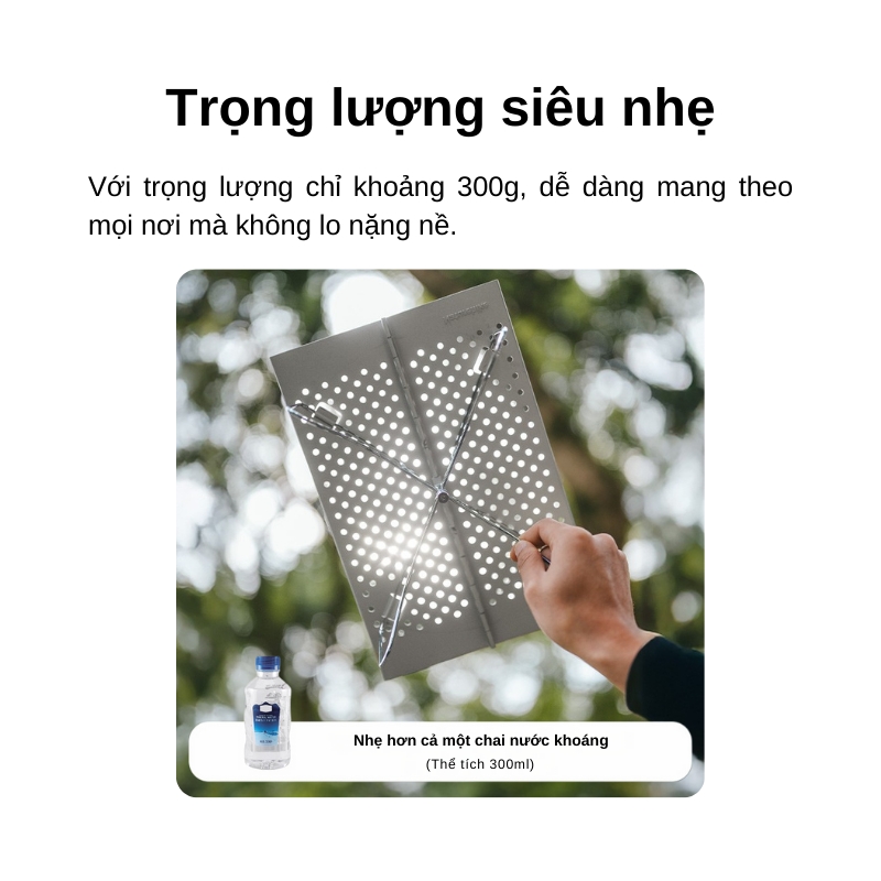 Thiết kế gập phẳng toàn bộ mặt bàn và khung chân giúp bạn mở ra – cố định điểm tựa chỉ trong vài động tác, đóng lại thành tấm mỏng để tối ưu thể tích khi di chuyển camping/trekking. Thông số cất gọn cỡ 31 × ~11 × ~2 cm và trọng lượng ~300 g là lợi thế lớn khi bạn ưu tiên set-up nhanh, dọn trại gọn.