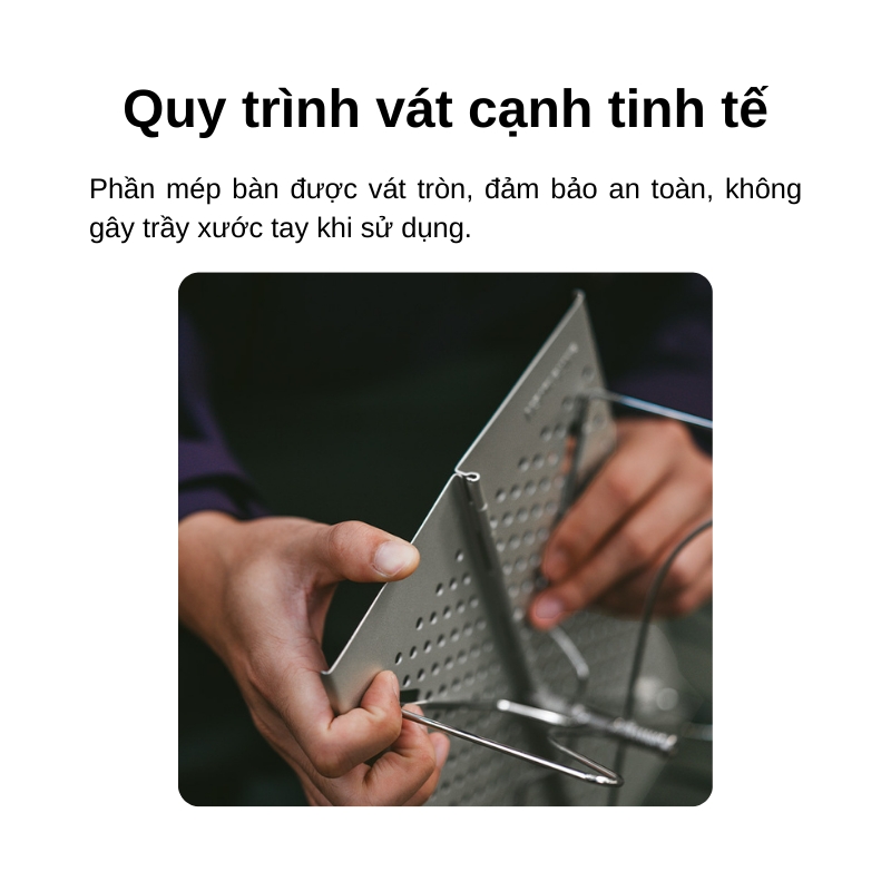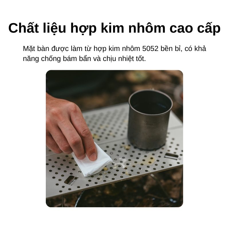 Cấu trúc chân giao chéo tạo thế tựa chắc hơn trên nền cỏ, đất hay sàn gỗ; bề mặt nhôm được xử lý oxy hóa/sơn tĩnh điện cho khả năng chống trầy và chống ăn mòn tốt, phù hợp vai trò bàn phụ dã ngoại và mini camp table trong nhiều điều kiện. (Đặc tả nhôm 5052/khung 304 theo tài liệu cửa hàng phân phối.)
