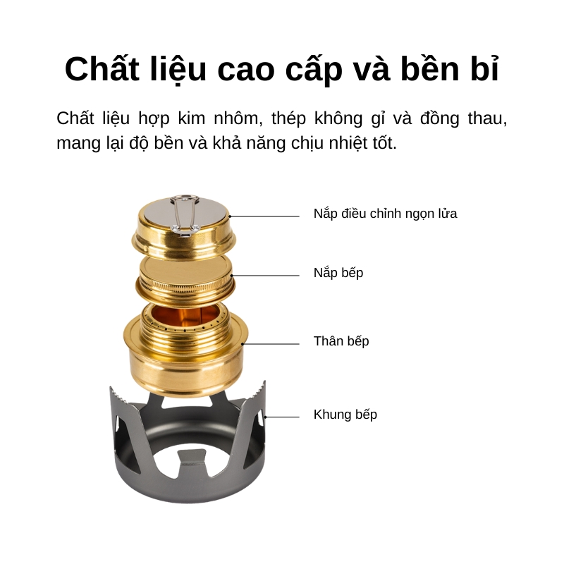 Vật liệu chắc chắn, dùng lâu dài: Khung đỡ bằng hợp kim nhôm kết hợp thân bếp kim loại giúp tổng thể bếp vừa nhẹ vừa cứng cáp. Khi đặt nồi, bếp giữ được độ ổn định, hạn chế rung lắc. Đây là điểm quan trọng với bếp cồn ngoài trời vì bề mặt đặt bếp thường không phẳng tuyệt đối.