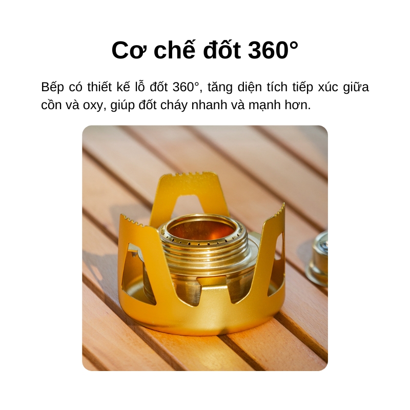 Đốt 360 độ, lửa ổn định: Bếp cồn nước dã ngoại sử dụng nguyên lý làm nóng thân bếp để cồn bay hơi và thoát ra qua các lỗ nhỏ xung quanh. Nhờ đó, ngọn lửa cháy đều 360 độ, nhiệt phân bố ổn định hơn so với kiểu đốt trực tiếp. Khi nấu ăn ngoài trời, điều này giúp hạn chế tình trạng cháy cục bộ và tiết kiệm nhiên liệu.