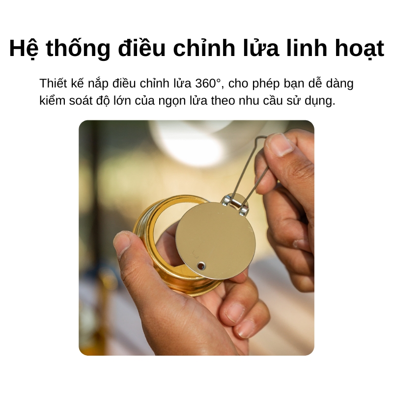 | Điều chỉnh lửa | Nắp xoay 360° kiểm soát ngọn lửa |