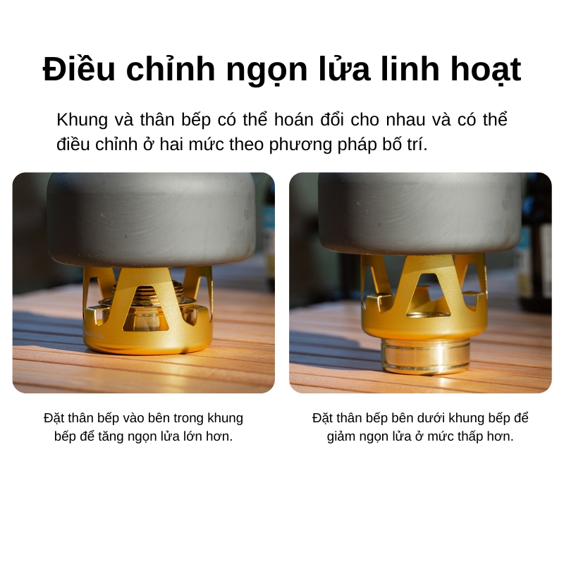 Điều chỉnh lửa linh hoạt: Không giống nhiều mẫu bếp cồn truyền thống chỉ có một mức lửa cố định, bếp cồn mini cắm trại này cho phép xoay nắp để điều chỉnh cường độ lửa. Việc chỉnh lửa giúp kiểm soát nhiệt tốt hơn khi đun nước, nấu soup hay hâm đồ ăn, nhất là trong không gian dã ngoại gió nhẹ.