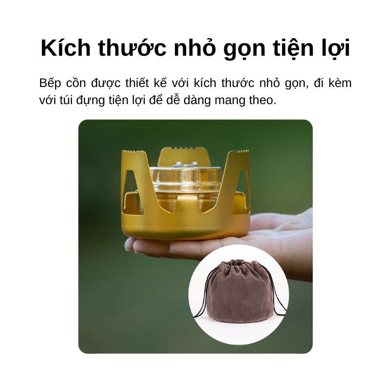 Gọn nhẹ, phù hợp nhiều chuyến đi: Với kích thước nhỏ và trọng lượng nhẹ, bếp cồn du lịch dễ dàng mang theo trong balo trekking hoặc bộ đồ nấu ăn camping. Đi kèm túi đựng giúp việc cất giữ gọn gàng hơn, tránh ám mùi cồn sang các vật dụng khác.