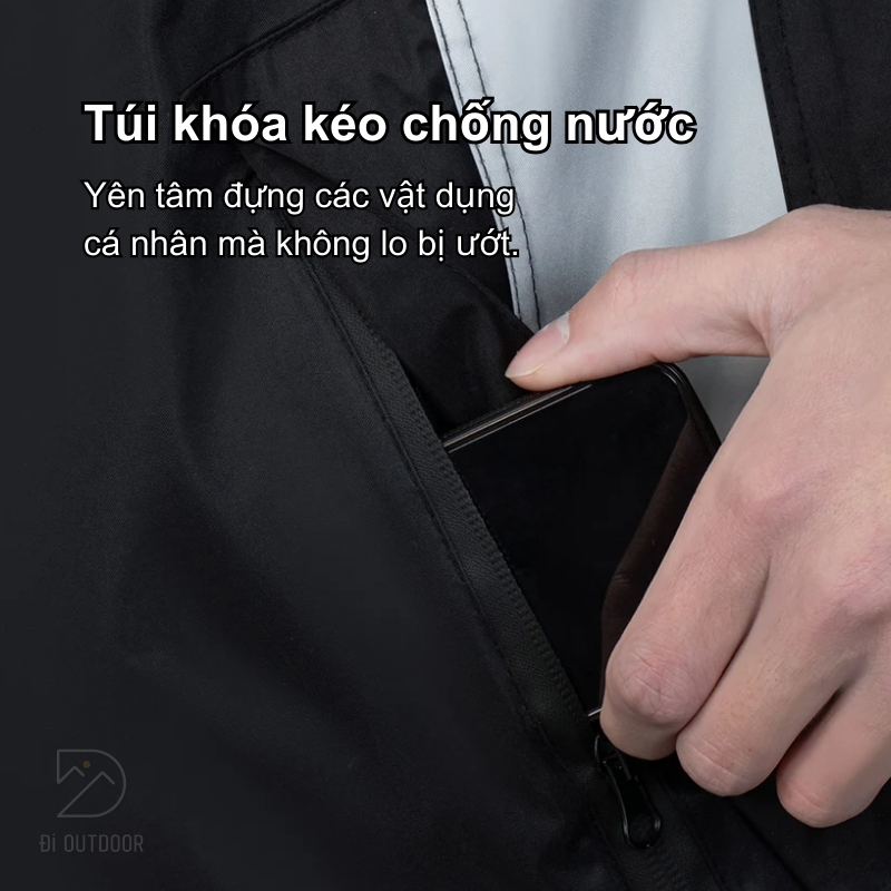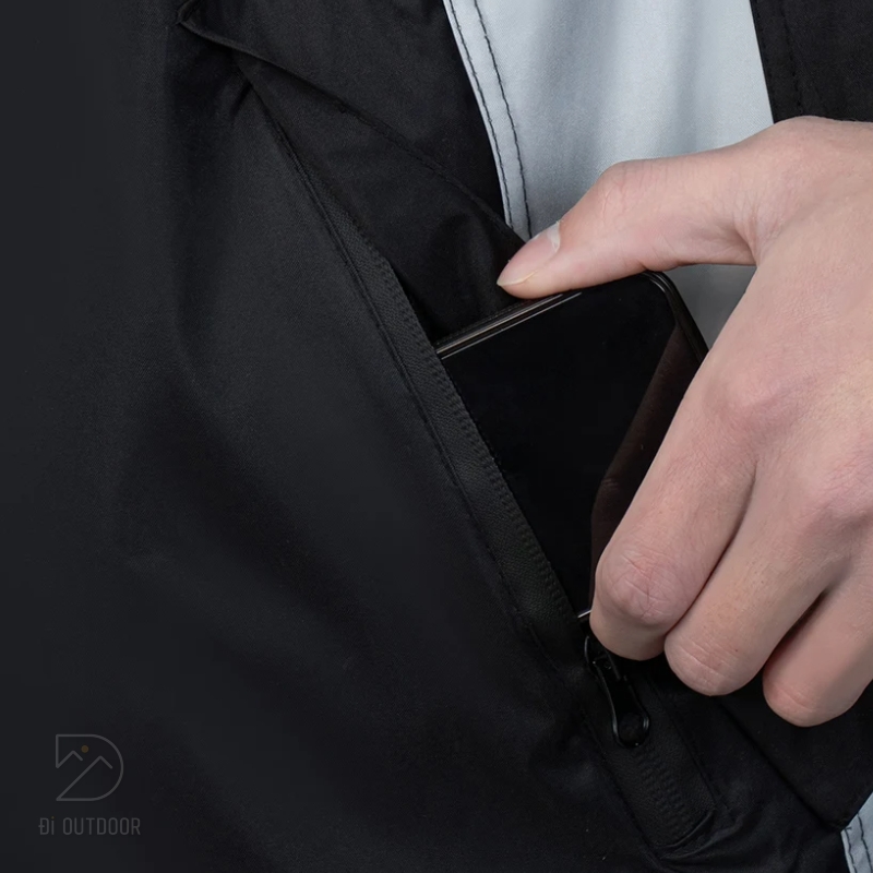 - Bảo vệ vật dụng: Bộ quần áo mưa có túi áo được trang bị khóa kéo chống nước, an toàn cho điện thoại và ví tiền.