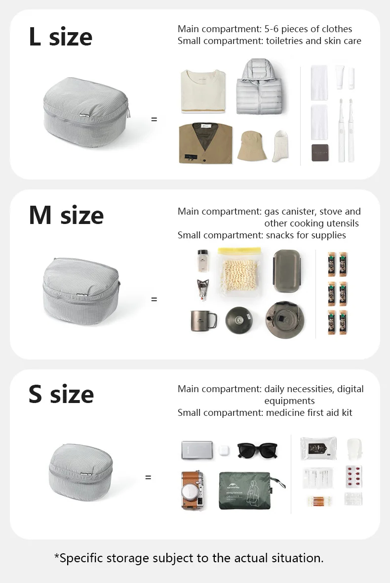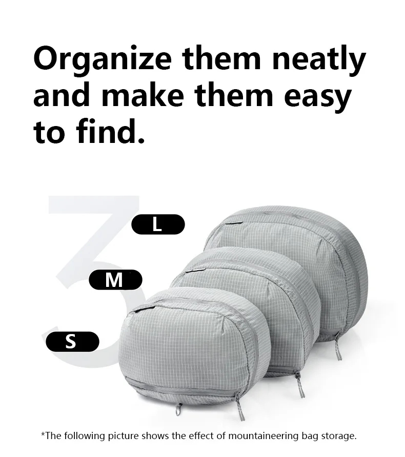 - Bộ 3 túi với nhiều cỡ khác nhau, dễ chia nhóm đồ theo mục đích
