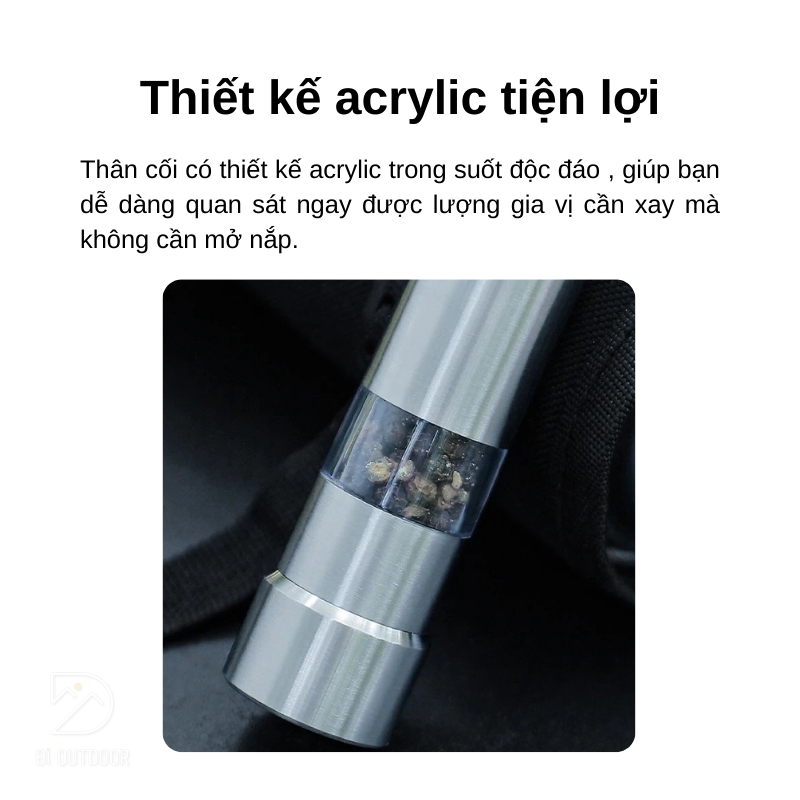 Với thiết kế acrylic trong suốt độc đáo , giúp bạn dễ dàng quan sát ngay được lượng gia vị cần xay mà không cần mở nắp, giúp tiết kiệm thời gian và công sức khi sử dụng sản phẩm.