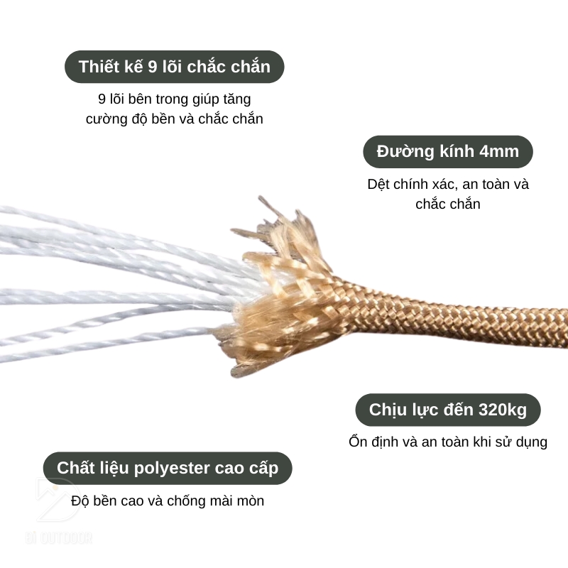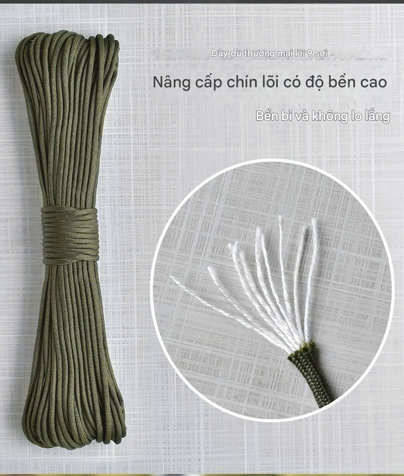- 9 lõi chịu lực: Thiết kế 9 lõi giúp tăng cường độ bền và độ chắc chắn cho các hoạt động căng lều, buộc đồ.