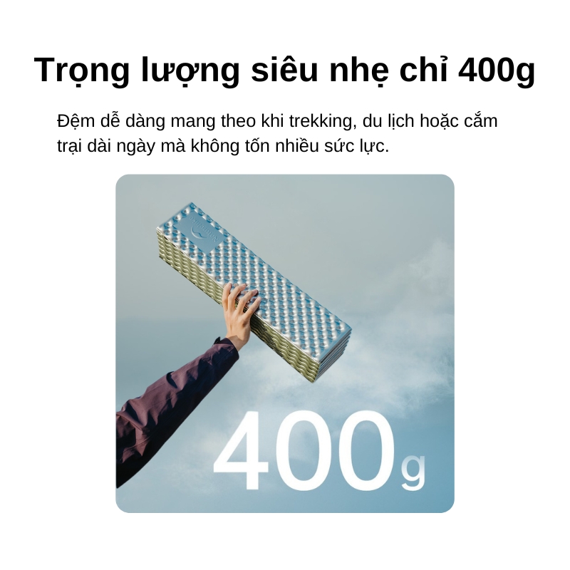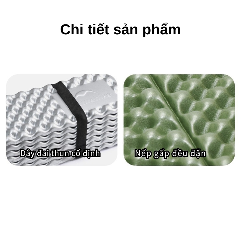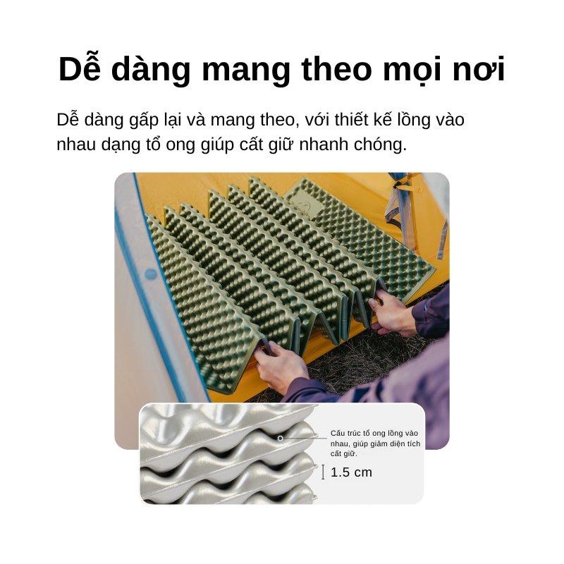 - Gấp gọn kiểu tổ ong (egg-crate folding pad): mở/gấp nhanh, dễ chằng ngoài balo.