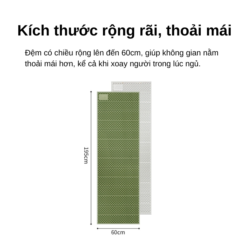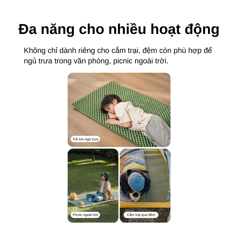 | Tính năng nổi bật | Cách nhiệt, chống ẩm, nhẹ, dễ gấp, không cần bơm hơi |