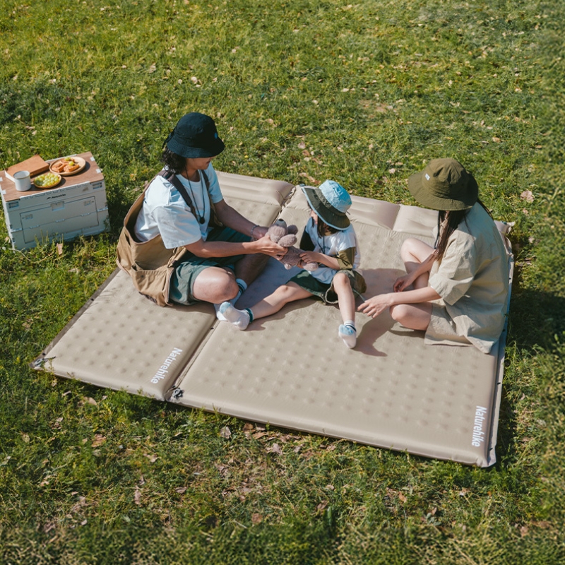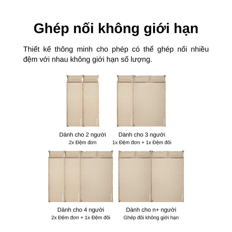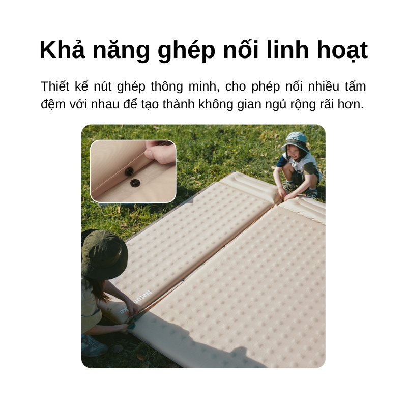 Cạnh đệm bố trí nút ghép để kết nối hai tấm đệm đơn thành bề mặt lớn, hoặc phối giữa đệm đơn và đệm đôi cho gia đình. Khi dựng lều cho nhóm, giải pháp ghép nối giúp tạo mặt phẳng ngủ liền mạch, hạn chế khe hở và dịch chuyển trong đêm.