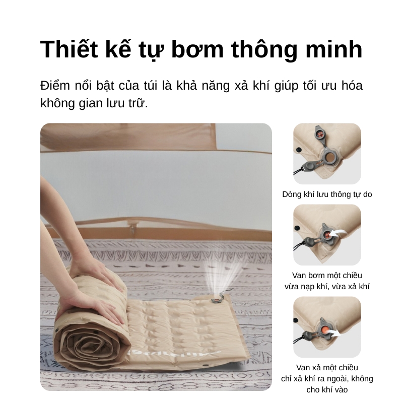 Hệ van hai chiều giúp đệm tự hút khí đạt phần lớn thể tích ngay sau khi mở van; người dùng chỉ cần bổ sung vài hơi hoặc bơm tay nhẹ để đạt độ căng mong muốn. Cơ chế xả khí diễn ra nhanh, hỗ trợ cuộn gọn và cất vào túi trong ít thao tác, phù hợp nhịp di chuyển liên tục khi trekking hoặc camping theo lịch trình chặt chẽ..