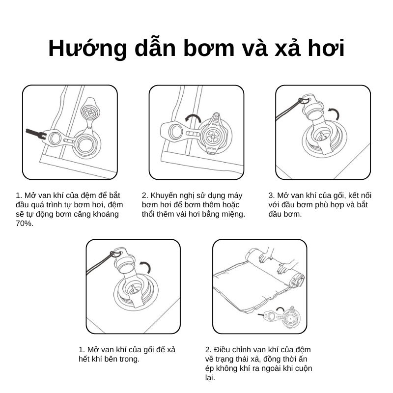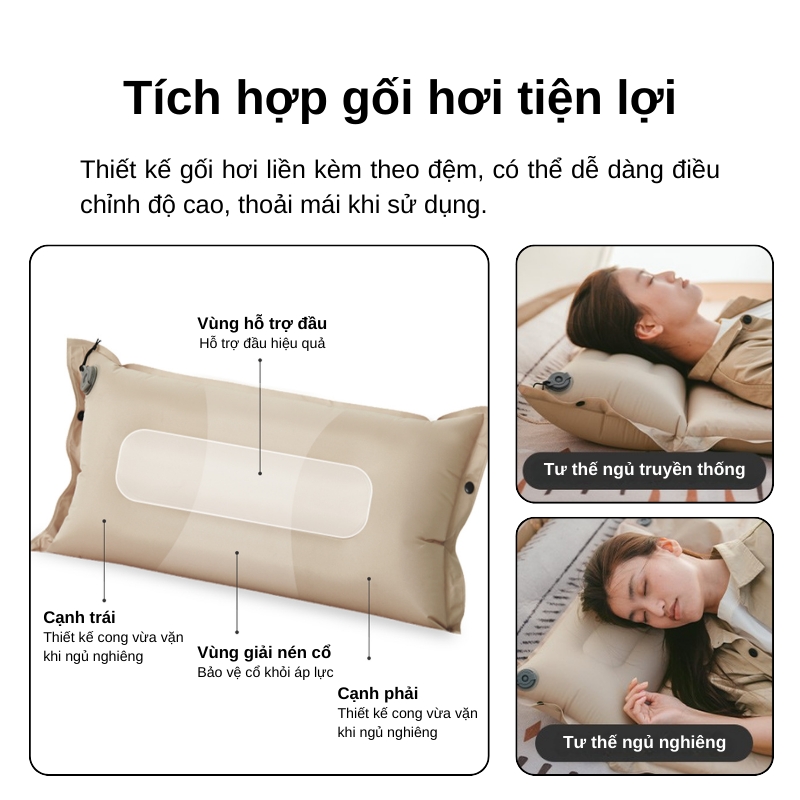 Cụm gối hơi liền thân cho phép điều chỉnh nhanh độ cao chỉ bằng thao tác nạp hoặc xả khí, phù hợp người nằm ngửa lẫn nằm nghiêng. Vùng gối nâng đỡ đầu – cổ – vai tự nhiên, giúp cơ thể thư thái hơn sau ngày vận động.