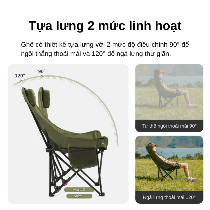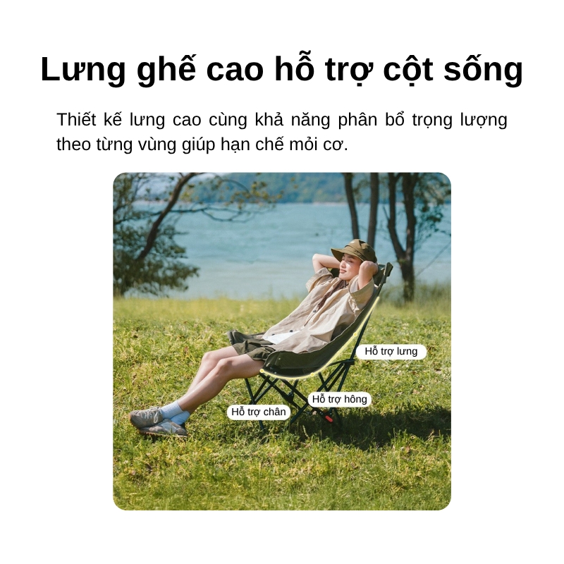 Camping & picnic: Dùng làm ghế dã ngoại cạnh bàn nấu/coffee station; tựa 120° cực hợp chợp mắt sau chặng đi phượt.