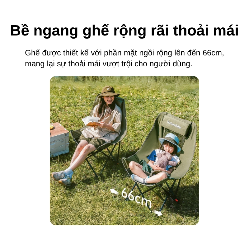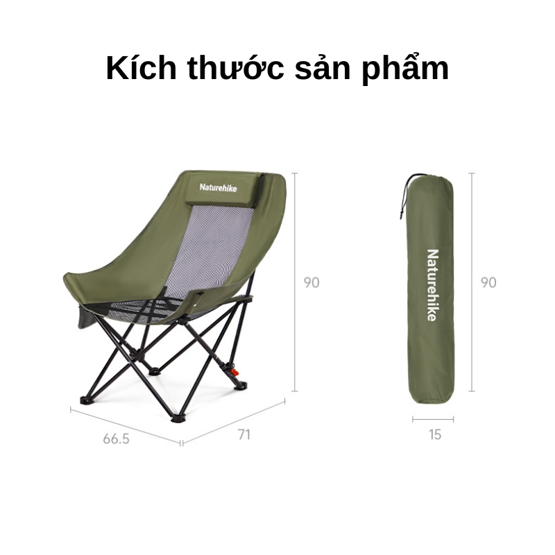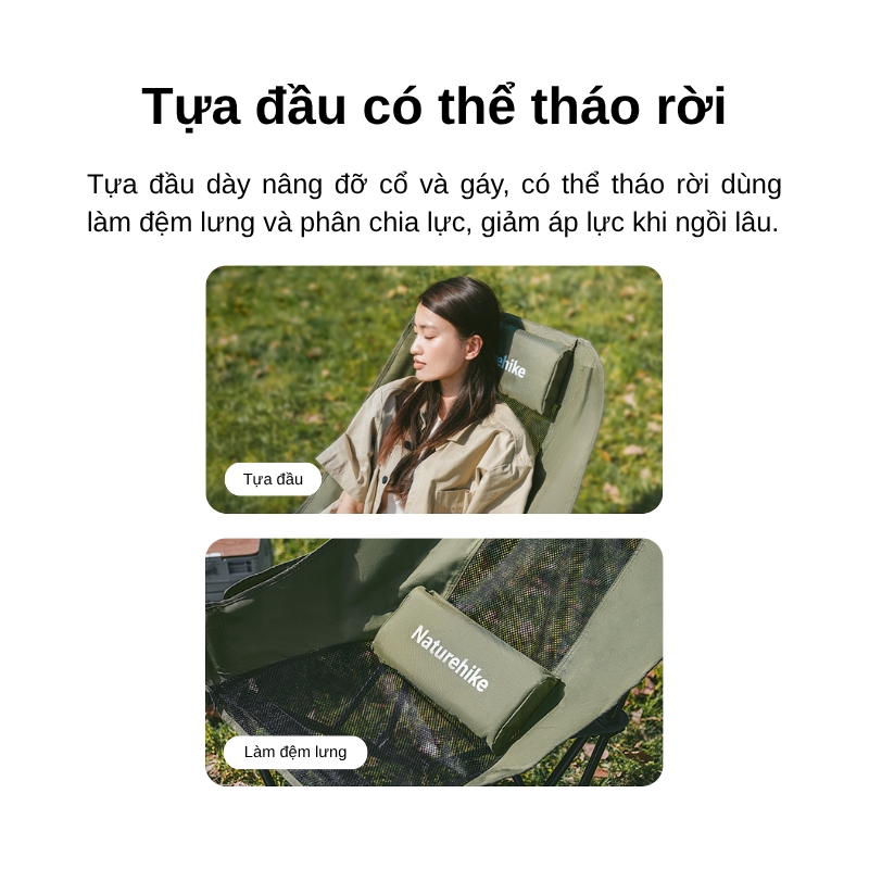 Đệm đầu dày ~5.5 cm nâng đỡ vùng cổ & lưng trên; khi cần có thể tháo rời dùng như đệm lưng. Sự linh hoạt này giúp ghế camping Naturehike luôn êm ái từ tư thế ngồi thẳng tới ngả lưng thư giãn.