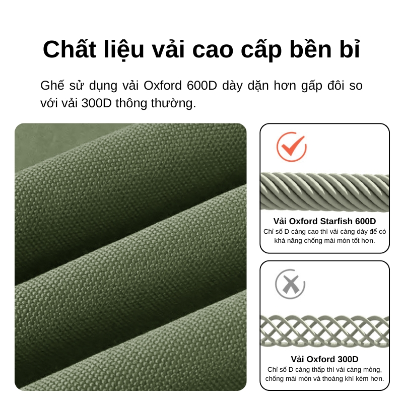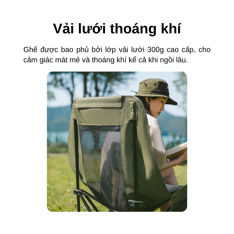 Thiết kế tựa cao ôm lưng, mặt ngồi rộng giảm cảm giác gò bó (kể cả người to hoặc thích ngồi khoanh chân). Chất liệu Oxford 600D phối lưới thoáng khí giúp tạm biệt bí nóng trong thời tiết oi ẩm—ưu thế lớn khi picnic hay ngồi lâu bên bếp.