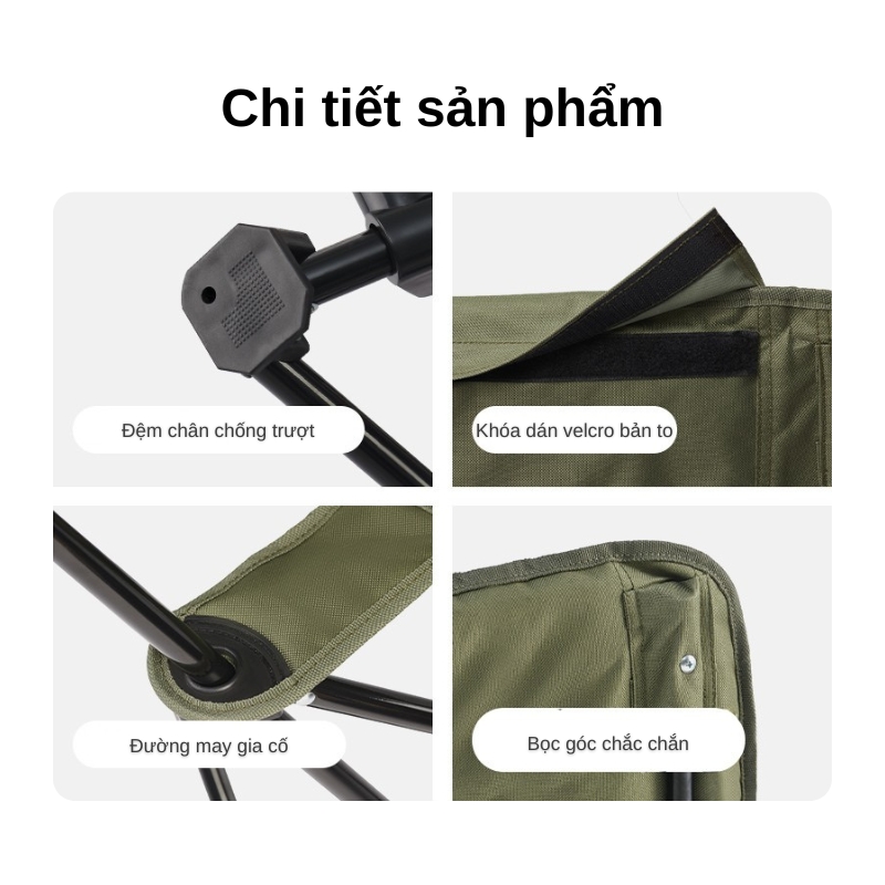 Ghế được trang bị đệm chân chống trượt, khóa dán Velcro bản to, các đường may gia cố và bọc góc chắc chắn để đảm bảo an toàn khi sử dụng. Thiết kế tinh tế này giúp người dùng yên tâm sử dụng trong mọi điều kiện địa hình.
