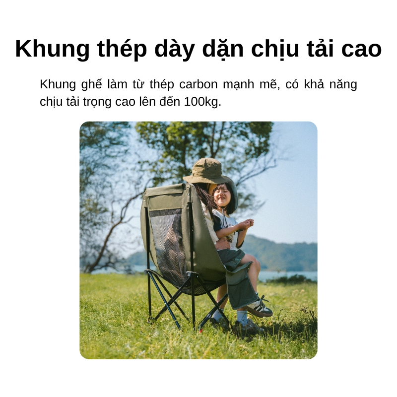 Khung thép carbon dày dặn, điểm nối gia cố, chân có đệm chống trượt: ngồi chắc, hạn chế rung lắc. Ghế gấp gọn Naturehike Sea Star 002 đạt tải trọng tham chiếu 100 kg, phù hợp nhiều thể trạng sử dụng ngoài trời