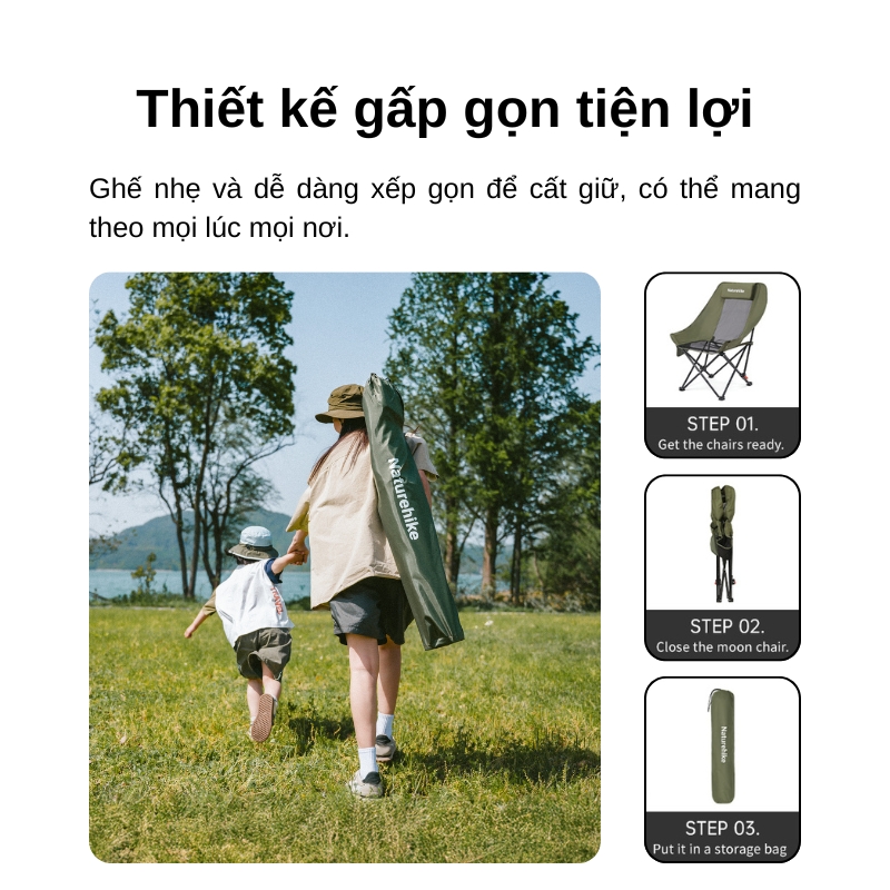 Chỉ ~2.75 kg, gấp 15×15×90 cm, kèm túi đựng: di chuyển thoải mái giữa bãi cỏ, bờ suối, bãi biển hay sân vườn. Vừa vặn khoang hành lý xe hơi; dựng trại xong mở ghế moon chair ra là có góc chill.