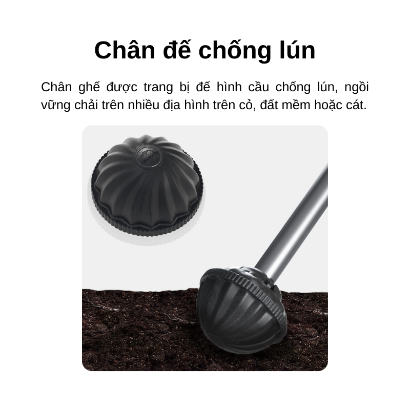Đế hình cầu tăng diện tích tiếp xúc, hạn chế lún trên cỏ, cát hay đất mềm. Khi trekking/hiking về trại, đặt ghế ở mép bờ suối hay bãi cỏ vẫn giữ sự ổn định cần thiết.