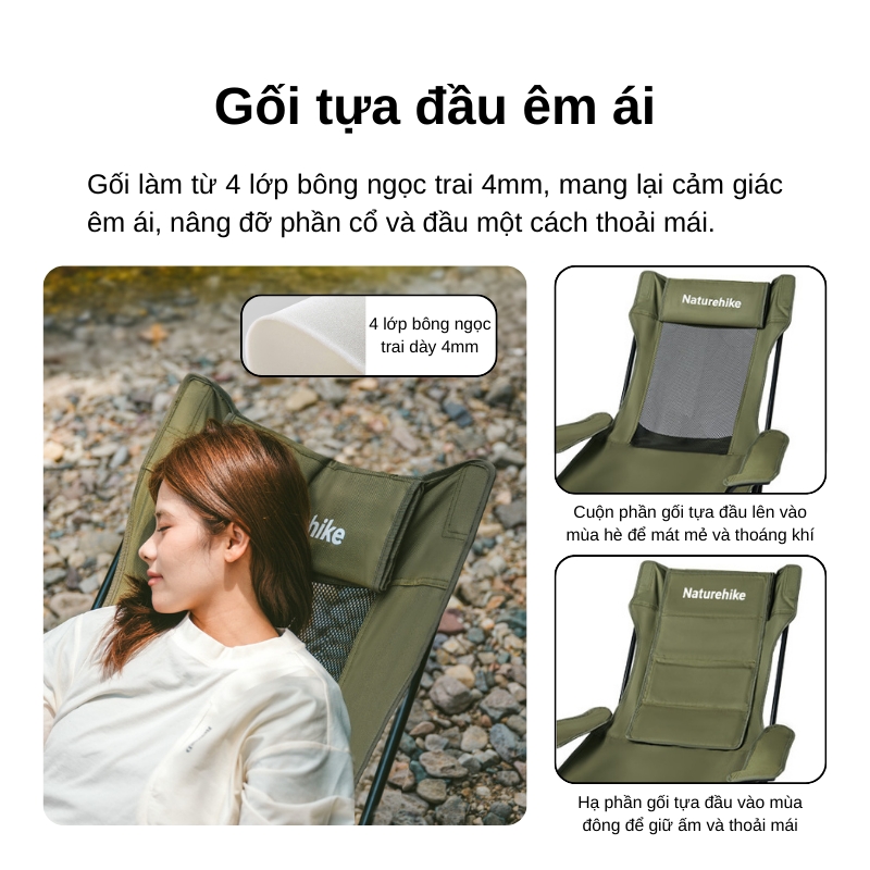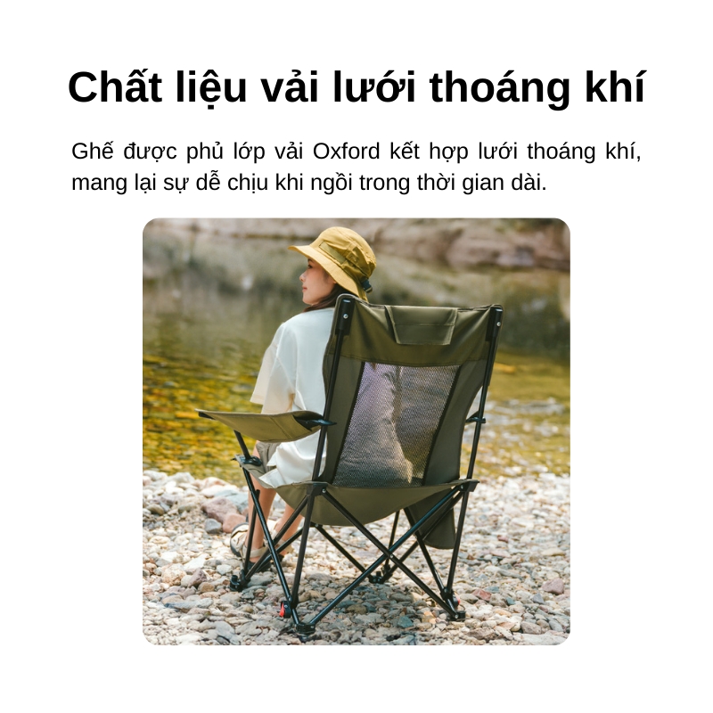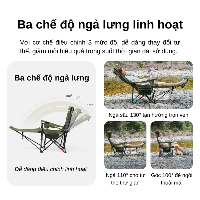 Cụm điều chỉnh cho phép chọn góc ngã 100° để ngồi trò chuyện, 110° để thư giãn nửa nằm và 130° để thả người nghỉ ngơi sau hoạt động ngoài trời. Việc thay đổi chế độ diễn ra mượt mà, giữ thân người ổn định trong suốt quá trình sử dụng.