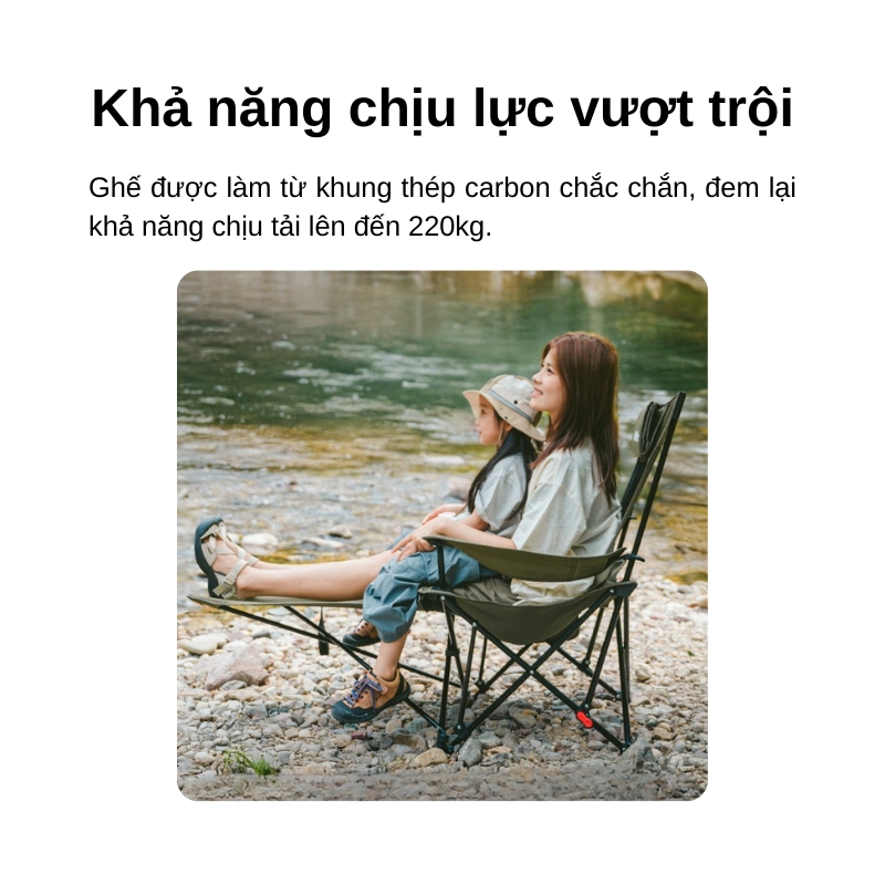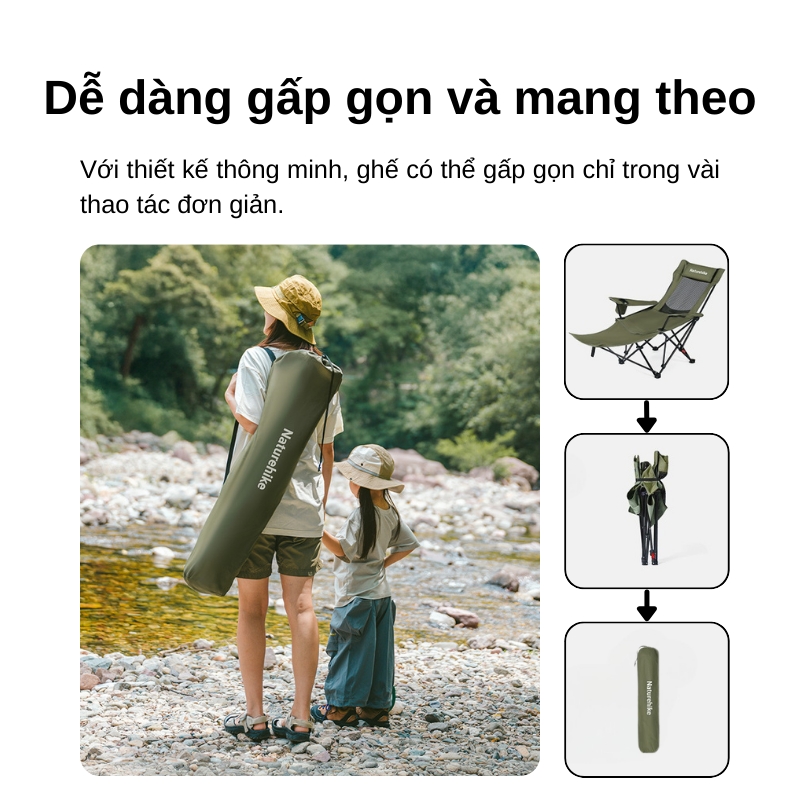Với trọng lượng chỉ khoảng 3.9kg, ghế có thể gấp gọn lại trong kích thước 17x17x90 cm và cho vào túi đựng đi kèm. Nhờ thiết kế nhỏ gọn, sản phẩm dễ dàng mang theo trong mọi chuyến đi, không gây cồng kềnh hay nặng nề.