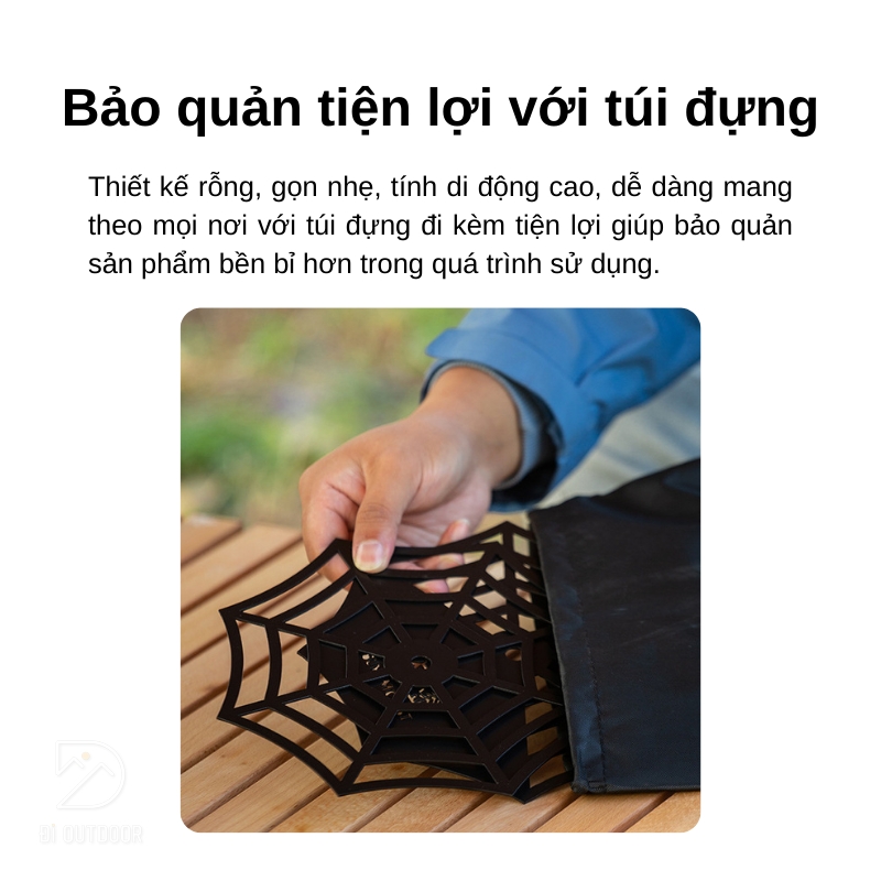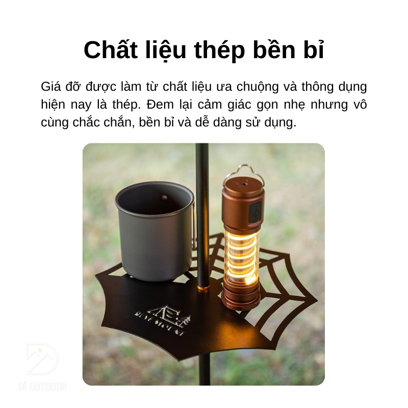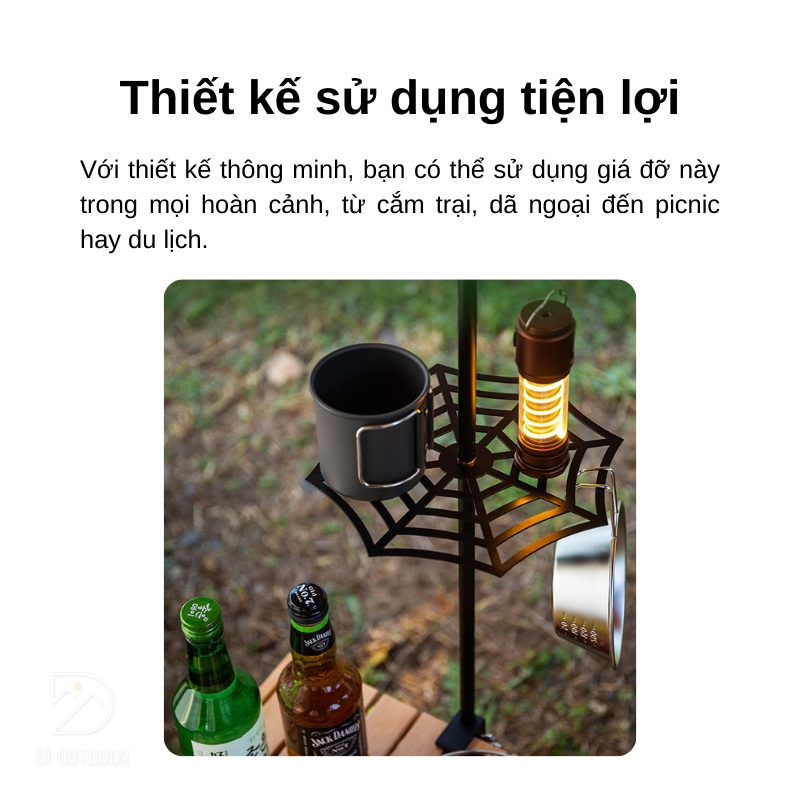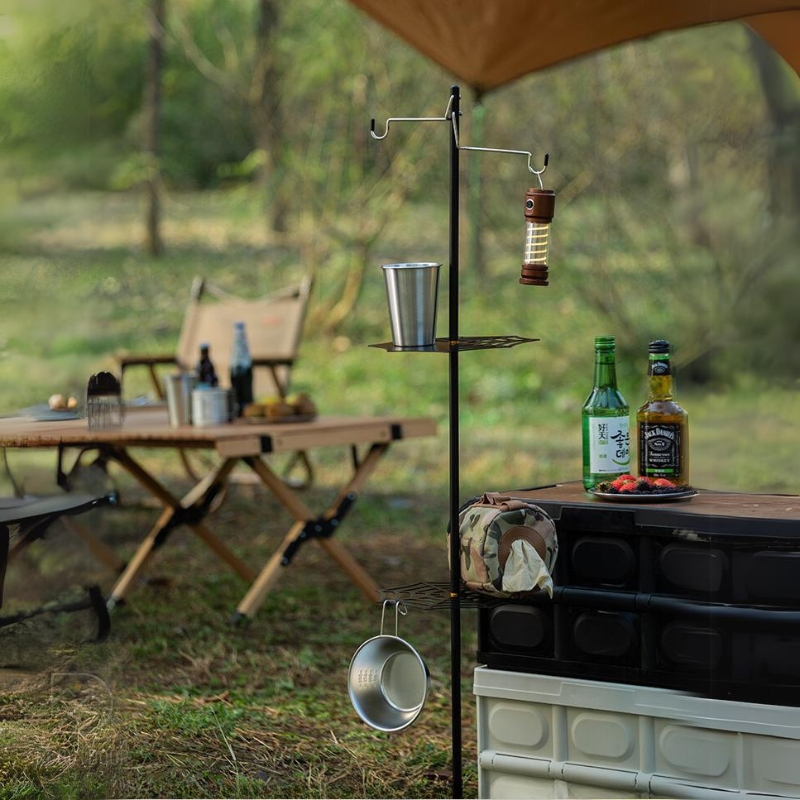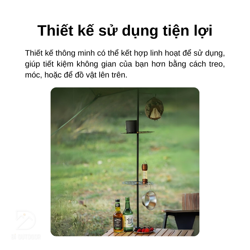 Với giá đỡ đồ tích hợp kèm giá treo đèn dã ngoại này, bạn sẽ không cần phải lo lắng về việc sắp xếp đồ đạc khi đi chơi hoặc cắm trại nữa. Thiết kế linh hoạt cho phép bạn dễ dàng treo đèn, móc nồi chảo, hay để chai nước lên trên mà không tốn nhiều không gian. Điều này giúp bạn tổ chức đồ đạc một cách hiệu quả và tiện lợi hơn, để bạn có thể tận hưởng những chuyến du lịch một cách thoải mái nhất.