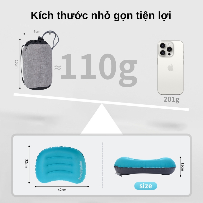 Với trọng lượng chỉ 83g (khoảng 2.93oz), gối NH17T013-Z là một trong những mẫu gối hơi nhẹ nhất trên thị trường. Bạn có thể dễ dàng mang theo mà gần như không cảm nhận được thêm bất kỳ gánh nặng nào trong balo hay túi xách. Kích thước sau khi gấp gọn chỉ khoảng 10x6cm, tương đương với lòng bàn tay, giúp bạn cất giữ trong túi quần, túi hông hoặc ngăn phụ của vali một cách tiện lợi.