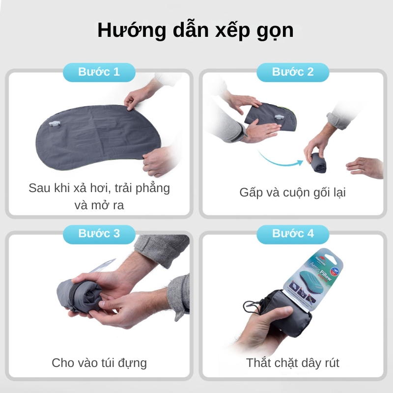 Khi xả hơi, gối cuộn lại nhỏ gọn cỡ lòng bàn tay, thuận tiện cất trong túi hông, ngăn phụ vali hay khoang nắp balo; đặc tính này đặc biệt hữu ích với những ai đề cao tính ultralight và khả năng sẵn sàng mọi lúc.