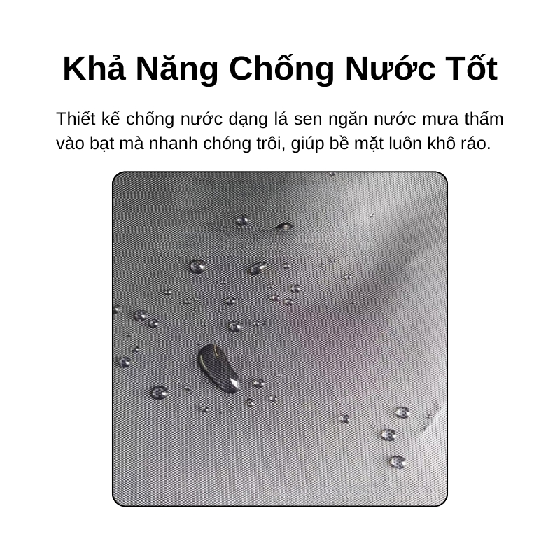 Thiết kế chống nước theo kiểu lá sen giúp nước mưa không bị thấm vào bạt mà nhanh chóng trôi đi, giữ cho bề mặt luôn khô ráo. Điều này đặc biệt hữu ích khi bạn sử dụng tăng bạt làm mái che lều trại hoặc làm tấm lót cách ẩm dưới nền đất.