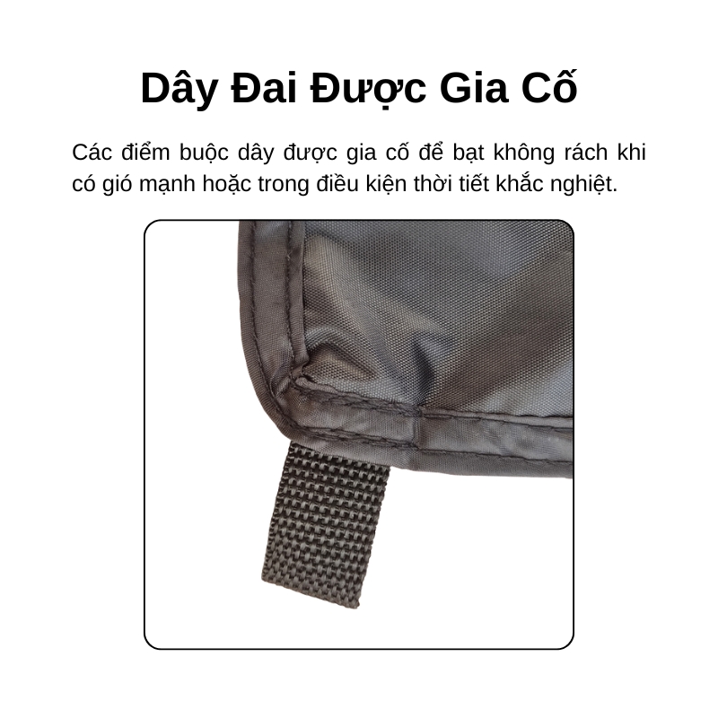 Ngoài ra, các điểm buộc dây cũng được gia cố cẩn thận để đảm bảo bạt không bị rách khi gặp gió mạnh hoặc khi sử dụng trong điều kiện thời tiết khắc nghiệt.