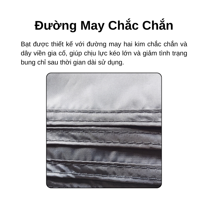 Để tăng độ bền, sản phẩm được thiết kế với đường may hai kim chắc chắn kết hợp với dây viền gia cố tại các mép bạt. Nhờ đó, bạt có thể chịu được lực kéo lớn và hạn chế tình trạng bung đường chỉ sau thời gian dài sử dụng.