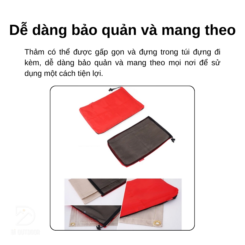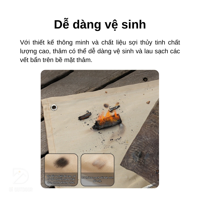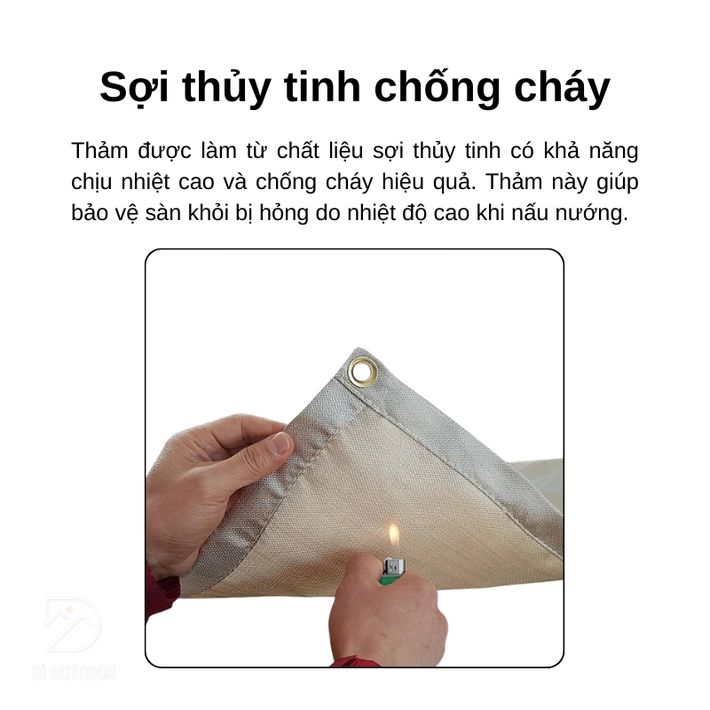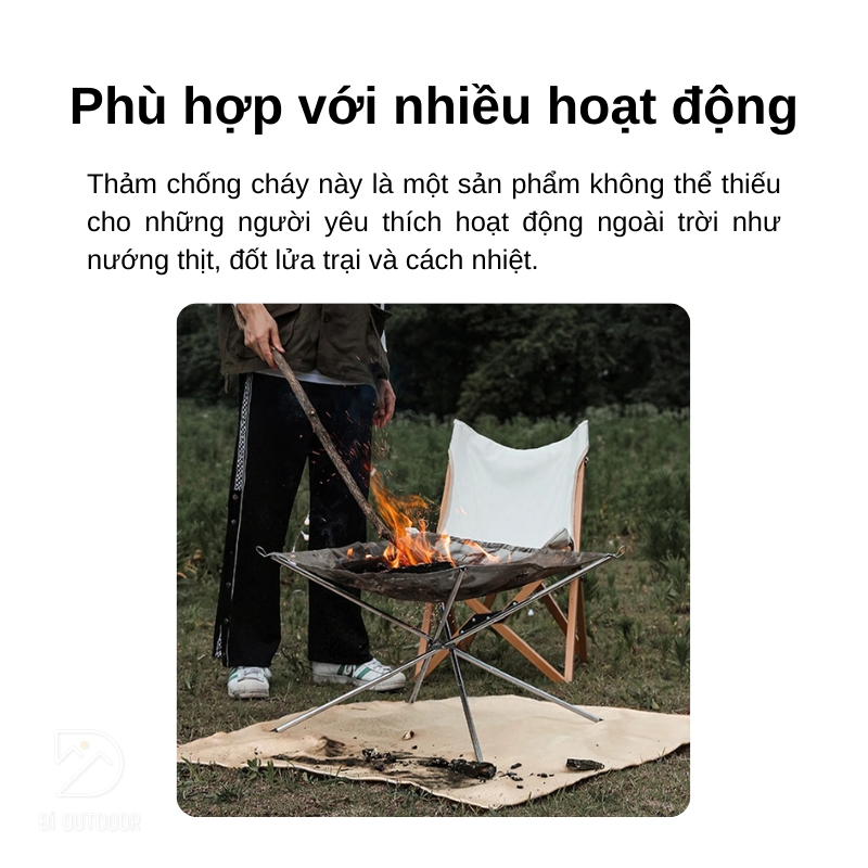 Với khả năng giúp bảo vệ không gian xung quanh khỏi nguy cơ cháy nổ và đồng thời giữ cho mặt đất không bị hỏng do nhiệt độ cao. Thảm chống cháy cũng là một phần quan trọng trong việc duy trì an toàn khi nấu nướng ngoài trời. Với sự linh hoạt và tiện lợi, sản phẩm này sẽ giúp bạn thưởng thức những hoạt động nấu nướng một cách an toàn và thoải mái hơn. Thích hợp cho những người yêu thích hoạt động ngoài trời như nướng thịt, đốt lửa trại,..