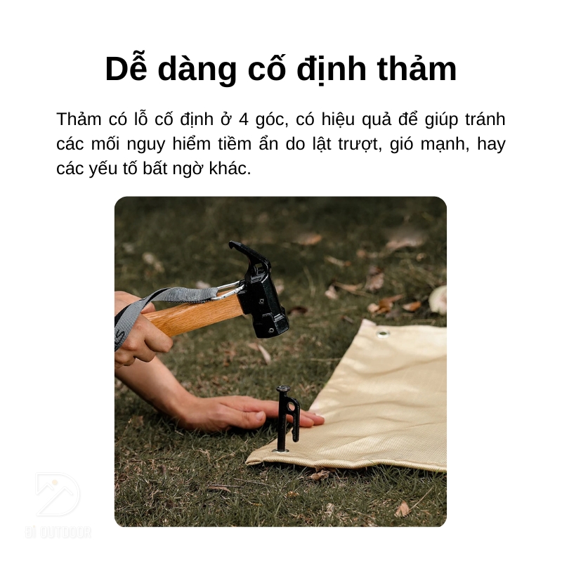 Với các lỗ cố định ở 4 góc, bạn có thế đóng cọc đất vào để giúp thảm giữ vững vị trí của nó mà không bị trượt khi bạn đang nấu nướng, hoặc các yếu tố bất ngờ như gió mạnh khiến thảm di chuyển bị lật đổ gây nguy hiểm khi sử dụng.