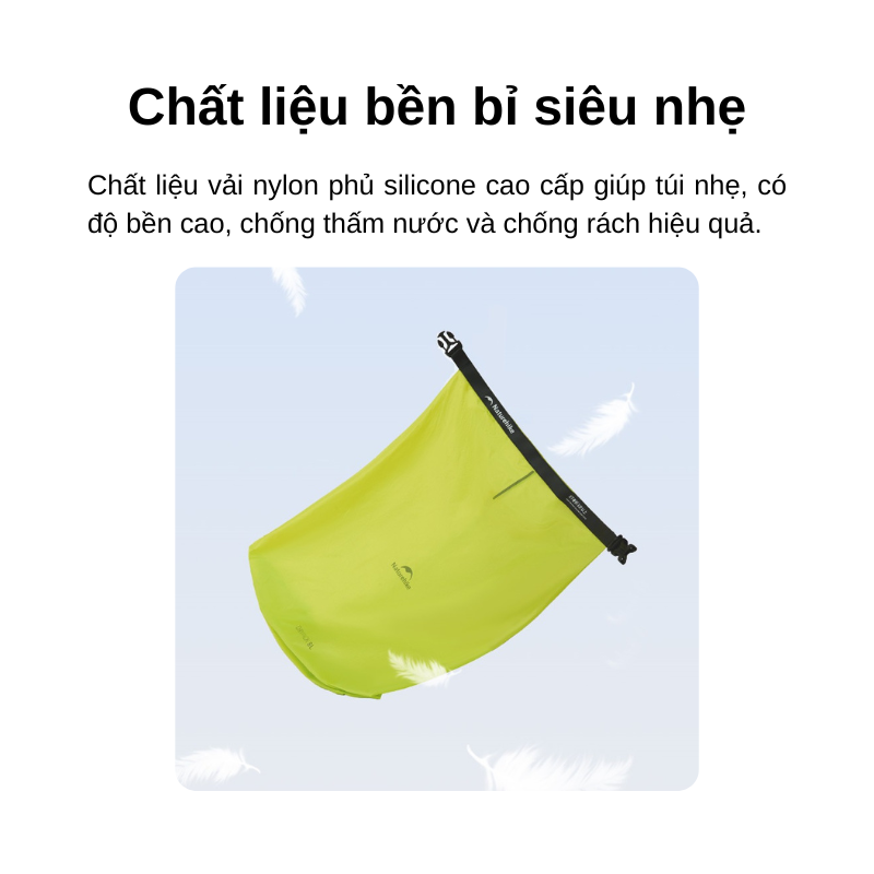 Sợi polyamide phủ silicone cho túi vừa nhẹ vừa bền, chống mài mòn tốt khi ma sát trong balo. Với mức ~30–49g, túi nén Naturehike gần như “không đáng kể” trên cân nặng, hợp phong cách ultralight camping.
