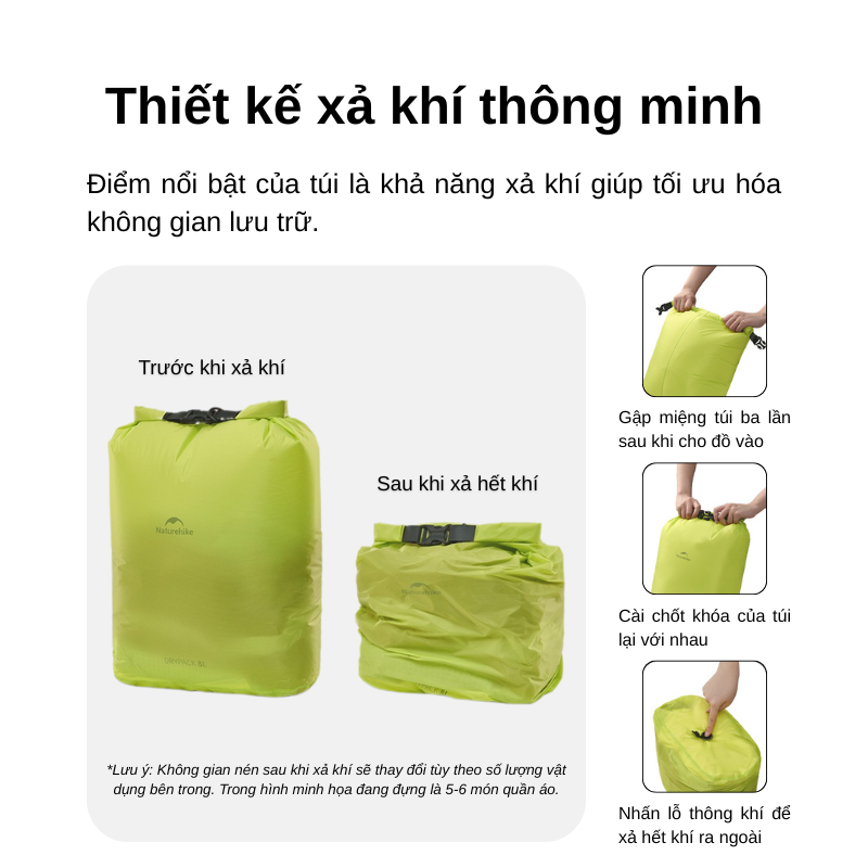 Sau khi cho đồ vào, cuộn miệng và ép xả khí để giảm đáng kể thể tích—balo gọn gàng, ít “độn”. Với quần áo mỏng, túi chống nước Naturehike kiêm luôn vai trò túi nén quần áo cực tiện.