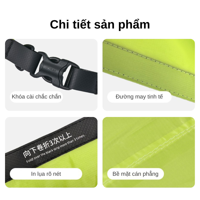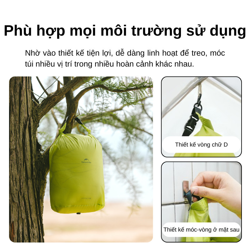 D-ring/móc treo tiện gắn balo hoặc dây ràng; khóa cài chắc tay, bề mặt cán phẳng, in sắc nét. Túi chống nước Naturehike giữ form đẹp, dùng ngoài trời hay sắp xếp đồ tại nhà đều hợp.