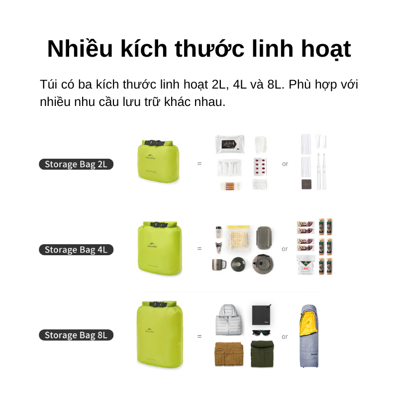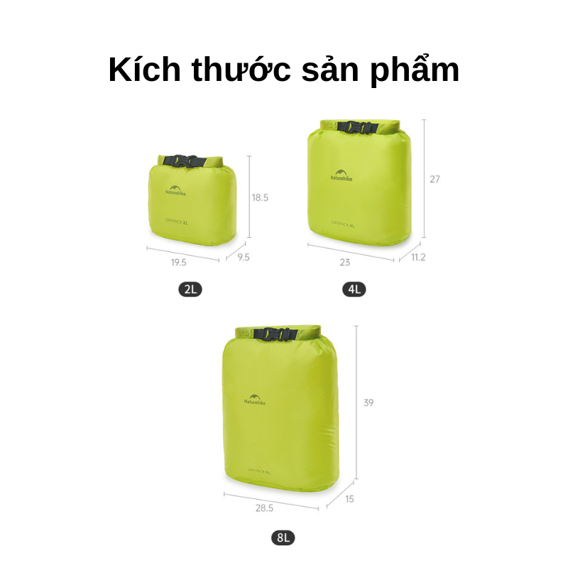 Túi chống nước Naturehike CNK2550XB012 là dry bag siêu nhẹ kiểu roll-top dành cho camping, trekking, hiking và đi phượt. Chất liệu nylon phủ silicone kháng nước PU2000mm+, nén khí gọn balo, ba dung tích 2/4/8L tối ưu phân loại đồ. Trọng lượng chỉ khoảng 30–49g, cuộn miệng 3 vòng là kín—đúng chất túi chống nước siêu nhẹ “đi đâu cũng tiện”.