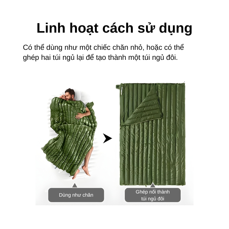 | Kiểu mở rộng | Mở hoàn toàn thành chăn hoặc ghép đôi thành túi ngủ đôi |