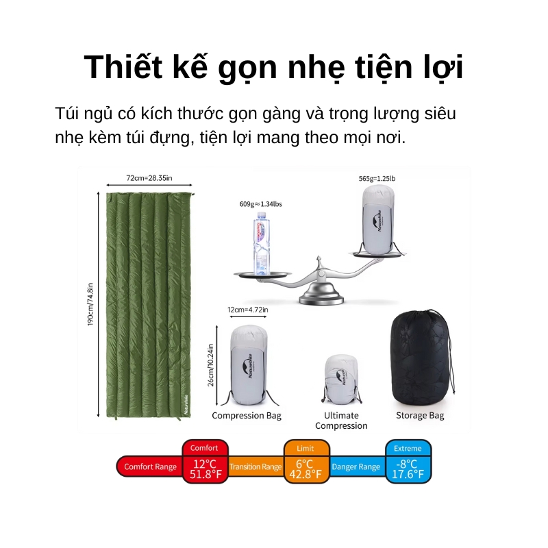 - Túi ngủ nén gọn 12×26cm: nhét balo gọn, không chiếm chỗ.